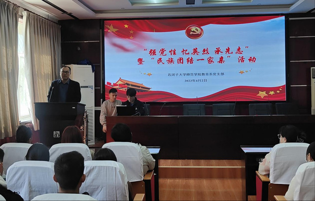为深入学习党的二十大精神,传承和弘扬中华民族优秀传统文化,加强304永利集团教育系教师与员工的交流,2023年4月2日下午,304永利集团本科生第一员工党支部与教育系教师党支部联合师范楼103报告厅举办了“忆英烈 承先志 强党性”暨“民族团结一家亲”党日活动。教育系党支部书记刘强老师致开幕词,本科生第一党支部青年委员许江洲领学党的二十大报告,以大家喜闻乐见的趣味知识竞答方式,加深支部成员对党史知识、二十大精神深刻的认识和理解。