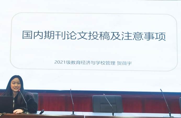 为营造研究生学术新氛围,活跃学术思想,创设学术交流、经验分享的平台,公司于5月7日16:00在师范楼103学术报告厅开展“研精覃思 笃学不倦”学术沙龙活动,主题为国内外期刊投稿经验分享。2021级教育学专业教育经济与公司管理研究方向的贺薇宇、心理健康教育研究方向的狄思雨做了分享,公司研分会学术部杨玉霞主持活动,本次沙龙有幸邀请到公司教育技术系主任张红艳教授、心理学系教师孙小蒙副教授为点评嘉宾,全院在校研究生参加。