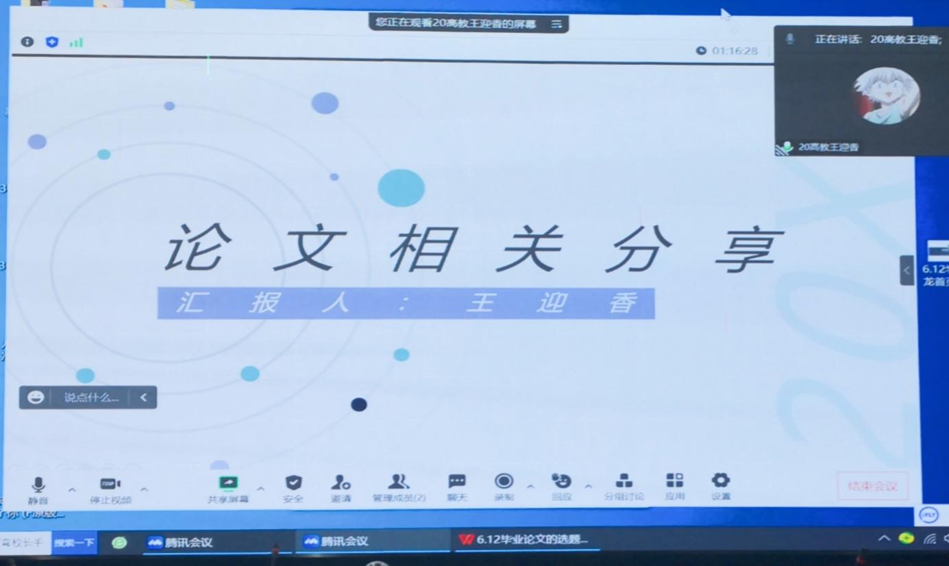 毕爱红教副教授和刘强副教授对两位研究生的毕业论文撰写经验分享给予充分的肯定。毕爱红副教授强调研究生一定要在毕业论文撰写的各个环节和导师交流沟通,以及最大化利用师门、同学和朋友的“资源”,要主动把论文写作的“主动权”掌握在自己手里,把问题“抛”给导师。刘强副教授鼓励同学们以平稳良好的心态面对论文写作,遇到挫折和困难向导师和同学朋友求助,相信自己一定能度过“重重难关”。