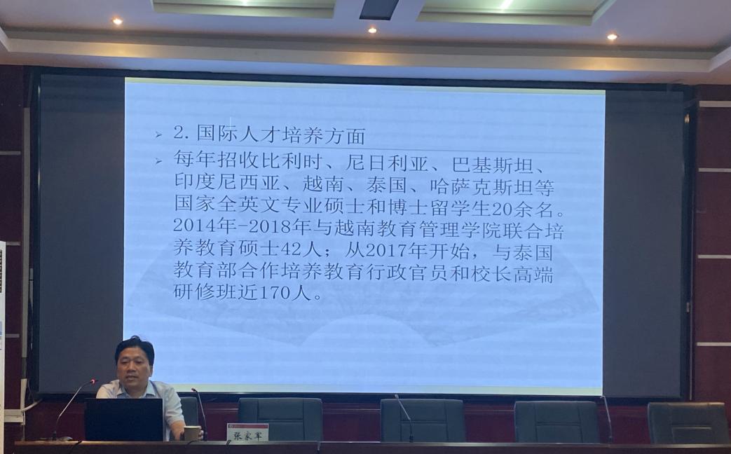 之后,张教授对教育学一流团队建设的成果作了展示。他特别提到在本科生人才培养方面设立的“晏阳初实验班”,培养的优秀本科生进入“双一流”大学读研率达到了90%,极大提高了本科生人才培养质量。一流团队建设中还介绍了“脱贫攻坚”“乡村振兴”“稳疆固边”等国家战略,研究成果受到了教育部的高度肯定。他们创建的“U-G-I-S”校地协同创新模式与12省市进行了联动,促进了区域和公司教育发展,开创了校地协同创新新模式,并创造了极大的协同经济效益,为团队建设添砖加瓦。