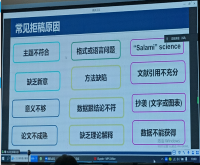 论文发表,合适了才能投。孔风老师就如何选择正确的审稿人和投稿期刊做了介绍,指出选择投稿期刊时需要考虑期刊声誉、目标受众、期刊标准、拒稿率、出版速度、出版费用、论文发表数多种因素。孔风老师图文并茂地详细阐述各因素,使师生明晰了应该从哪些方面选择适合发表自己论文的期刊。