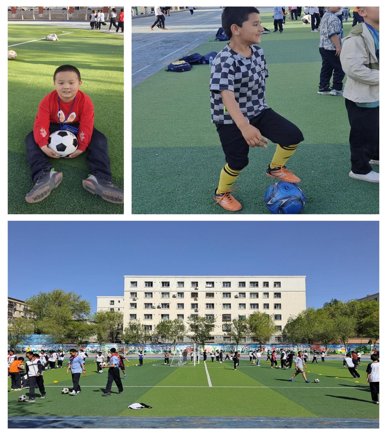 在大课间,小朋友们拿上自己的足球,以班级为单位到足球场集合。每个班由班主任带领,分为男女两队,在足球场进行训练。一部分员工严格依据技术要领,缓缓地沿着直线运球;而一些已经熟练的同学,则在尝试提升运球的速度;还有一部分同学则努力尝试抬起头,不看球,在运球的同时关注着球场上的状况;更有一些同学表现出色,他们不仅能将以上这些做得很好,还尝试在球场上放置数个障碍物,按照预先设计好的曲线运球路线进行练习,并且努力保持速度,同时做到不低头看球。小朋友们在一次次的训练中熟能生巧,在足球技术上获得很大的进步。操场上跃动着他们认真训练的身影,洋溢着他们活力四射的童年。