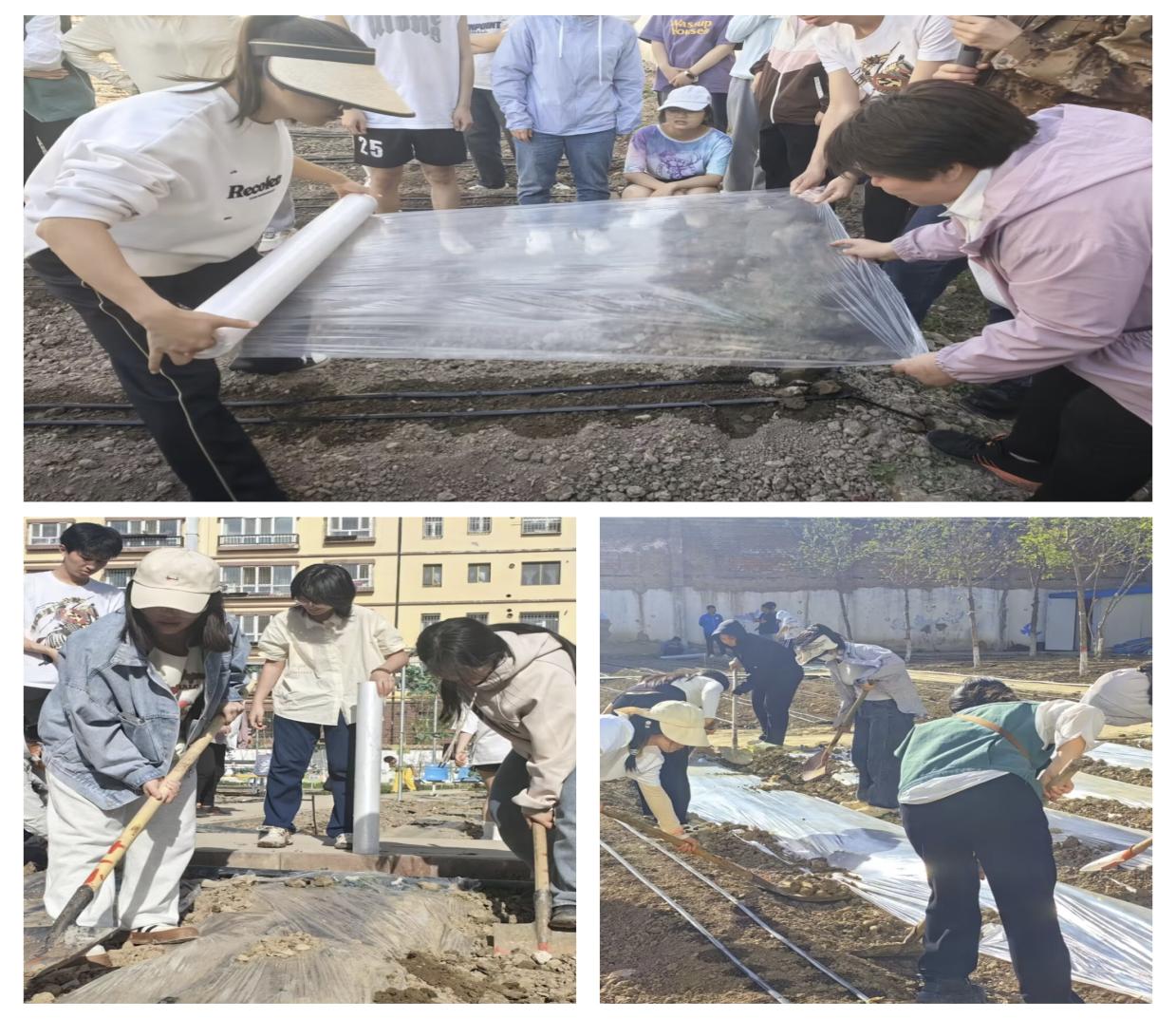接下来,同学们来到幸福石榴园劳动实践基地。七个小组各自领取了相应的劳动任务,随后按照分工安排前往地里开展劳动。铺膜小组由两个男孩子负责拉薄膜,女孩子则用铁锨在薄膜边缘进行盖土操作。在小组成员的默契协调配合下,一块块土地被薄膜完整且严实的覆盖。而种植草莓的小组也在辛勤劳作且相互配合,一部分小组成员在原来的草莓圃中挖掘草莓植株,另一部分则在新的种植园里进行移栽。没多久,草莓植株便被迅速且及时地移栽到了新的苗圃里。