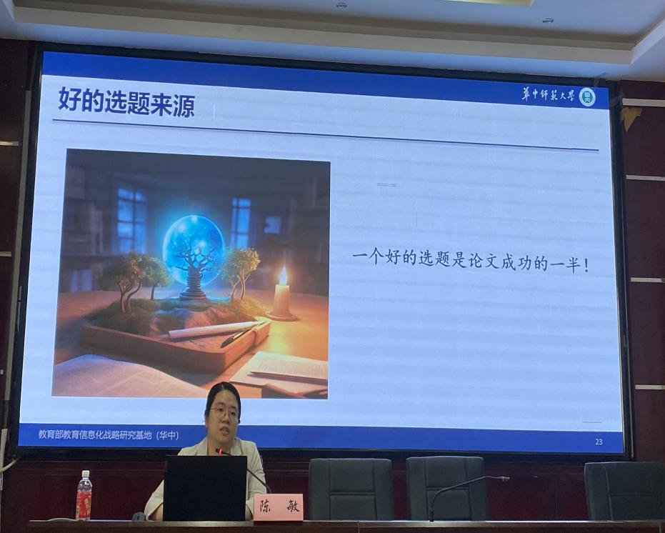 之后,陈老师阐述了SSCI论文选题的重要性。她指出,一个好的选题是成功的一半。她分享了五个选题来源,包括文献阅读、政策文件、教育实践、学科交叉以及学术会议等,并强调了选题时的注意事项,特别提到选题应具有现实意义和研究价值。