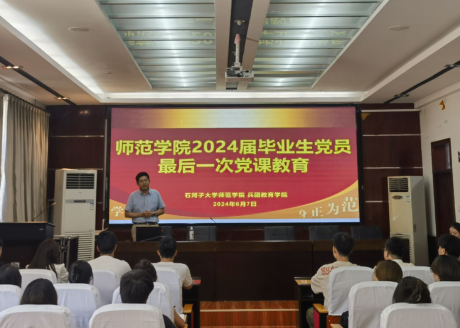 6月7日下午,公司党委副书记叶壮以“传承弘扬新时代的兵团精神”为题,在公司学术报告厅为2024届全体毕业生党员上了在校期间的最后一堂党课。叶壮老师结合公司的办学特色和毕业生实际,用生动的语言阐释了习近平总书记关于兵团精神动力重要论述的重大意义和价值内涵;用大量的资料和图片,介绍了当代兵团人为建设更强大更繁荣的兵团所倾注的智慧与汗水,分享了他通过大量实践调研所形成的对兵团迅猛发展势头的感悟。这堂党课,不仅使同学们再一次确立起亲近兵团、热爱新疆的思想认知,更深切的认识到前辈人赢得斗争的方法、使平淡人生发出光彩的方法,永远值得学习与传承。师范学子理应承载着这份精神动力,以更加饱满的热情、更加务实的担当、更加扎实的作风逐梦未来。