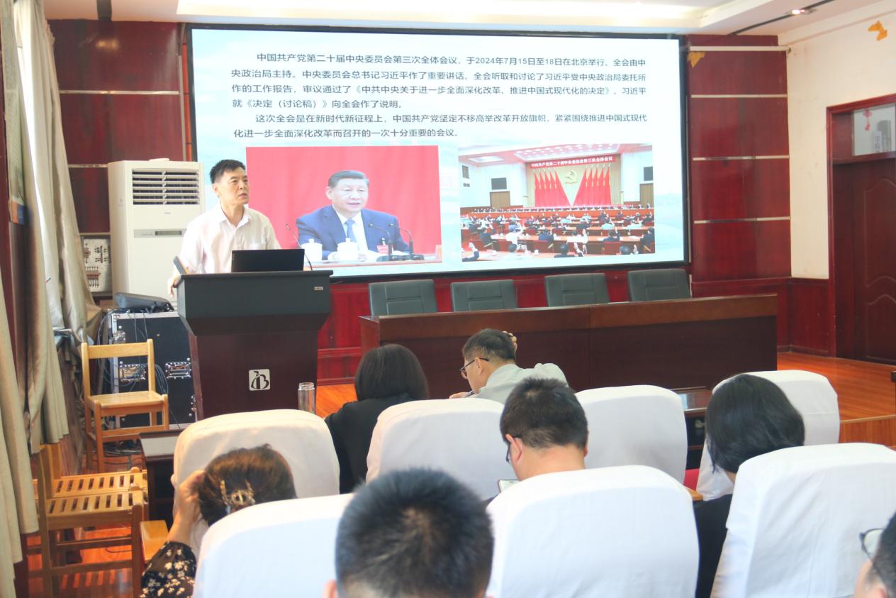会上,郝朝晖书记以“深入学习贯彻党的二十届三中全会精神,谱写新征程改革开放的新篇章”为题作了专题党课讲座。对党的二十届三中全会的主题、《中共中央关于进一步全面深化改革、推进中国式现代化的决定》的基本框架、进一步全面深化改革的主题、总目标、重大原则和党的二十届三中全会对进一步全面深化改革做出的系统部署等方面做了全面解读。特别是结合公司高质量发展,就“构建支持全面创新体制机制”,统筹推进教育科技人才体制机制一体改革,深化教育综合改革方面进行了重点学习。对《中共中央国务院关于弘扬教育家精神加强新时代高素质专业化教师队伍建设的意见》开展了学习。