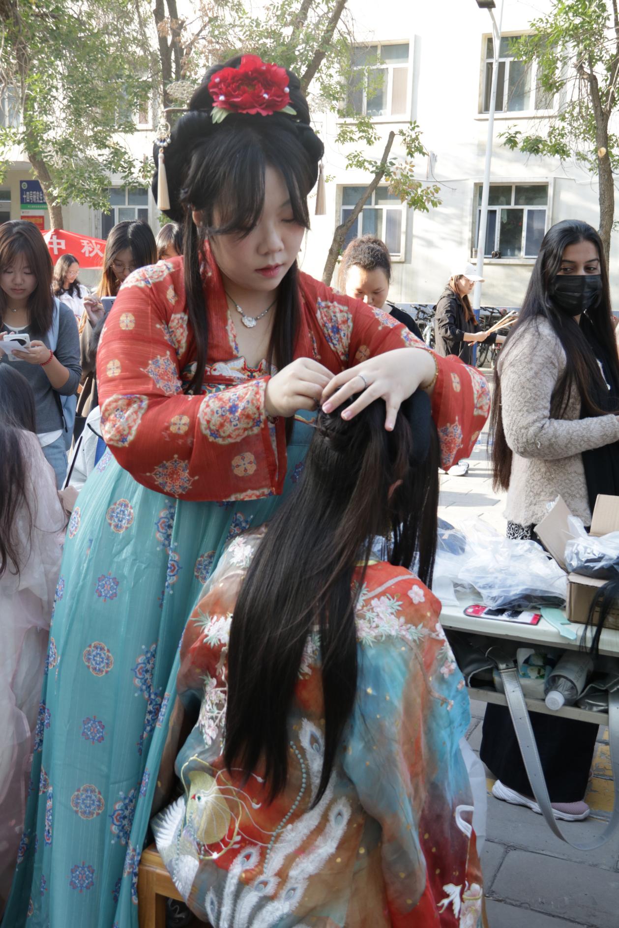 汉服妆造区,水月汉韵汉服社的同学们身着各式汉服,精致的妆容与华丽的服饰相得益彰,展现出汉服文化的独特魅力。他们或轻盈漫步,或翩翩起舞,让在场的师生们仿佛穿越回了千年前的盛世繁华。