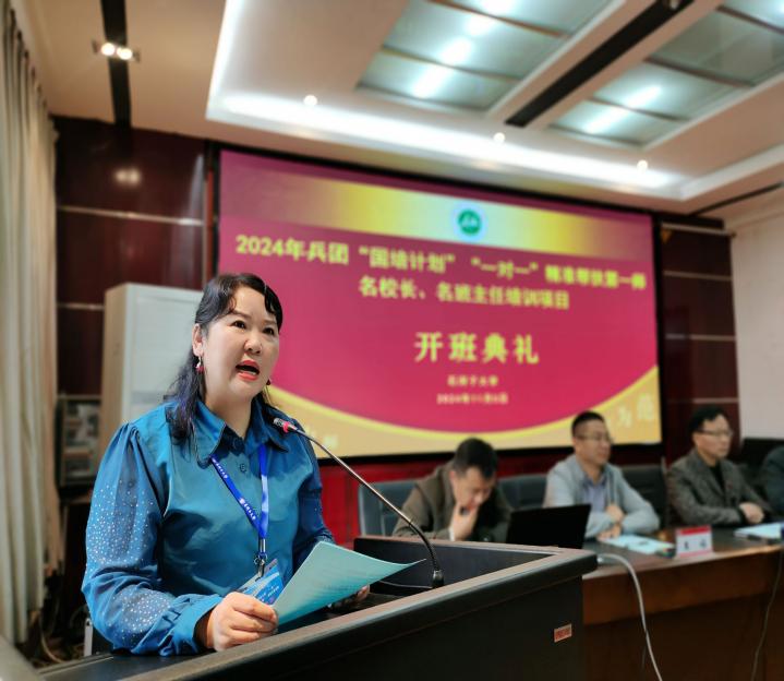 名班主任项目首席专家马萍老师就培训目标、课程设置作说明。第一师阿拉尔中学田锡荣董事长代表参训教师作表态发言。