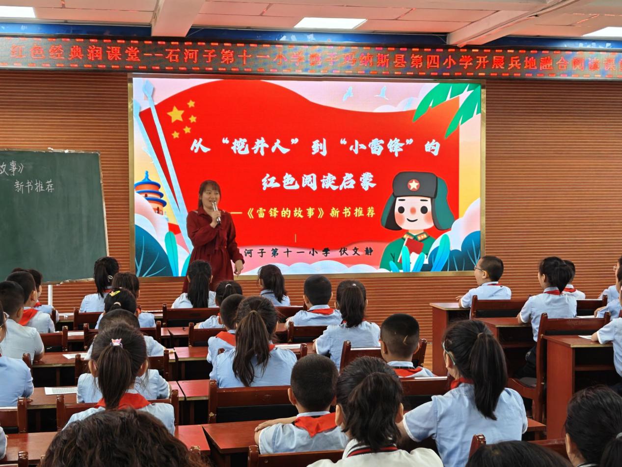 校园内洋溢着朗朗书声,浓郁的文化氛围和蓬勃的育人气象迎面而来。在“兵地书香共传承,红色经典润课堂”兵地融合阅读课堂教学展示活动中,由第十一小学的伏文静老师主讲《雷锋的故事》,巧妙地以“吃水不忘挖井人”为引,深入阐释了雷锋精神,引导员工通过观察插图、品味语言、解读标题和联系实际四个环节深入体验红色经典的内涵;玛纳斯县第四小学的史清健老师主讲《闪闪的红星》,以一颗红星为主题线索,向员工们传授了如何联系上下文、做批注、跳读等阅读技巧。课堂上,小员工们积极踊跃地举手发言,稚嫩却坚定的声音,传递出对红色精神的深刻理解,使在场的师范生们深刻感受到了教育唤醒生命的强大力量。