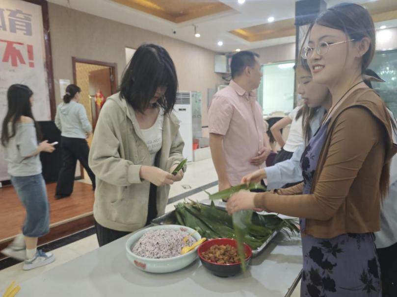 致辞结束后,活动迎来“粽叶连心”创意包粽环节。现场各族师生围坐成圈,互帮互助、默契协作。粽叶翻飞间,大家灵巧地折粽叶、填糯米、裹馅料、扎绳结,在欢声笑语中完成一个个精巧的粽子。粽叶清香与师生们的热情交融,传统习俗的独特魅力尽显无遗。大家在协作中拉近了距离,增进了情谊,文化认同在互动中不断深化,恰似紧密相依的石榴籽,团结情谊在包粽过程中愈加深厚。