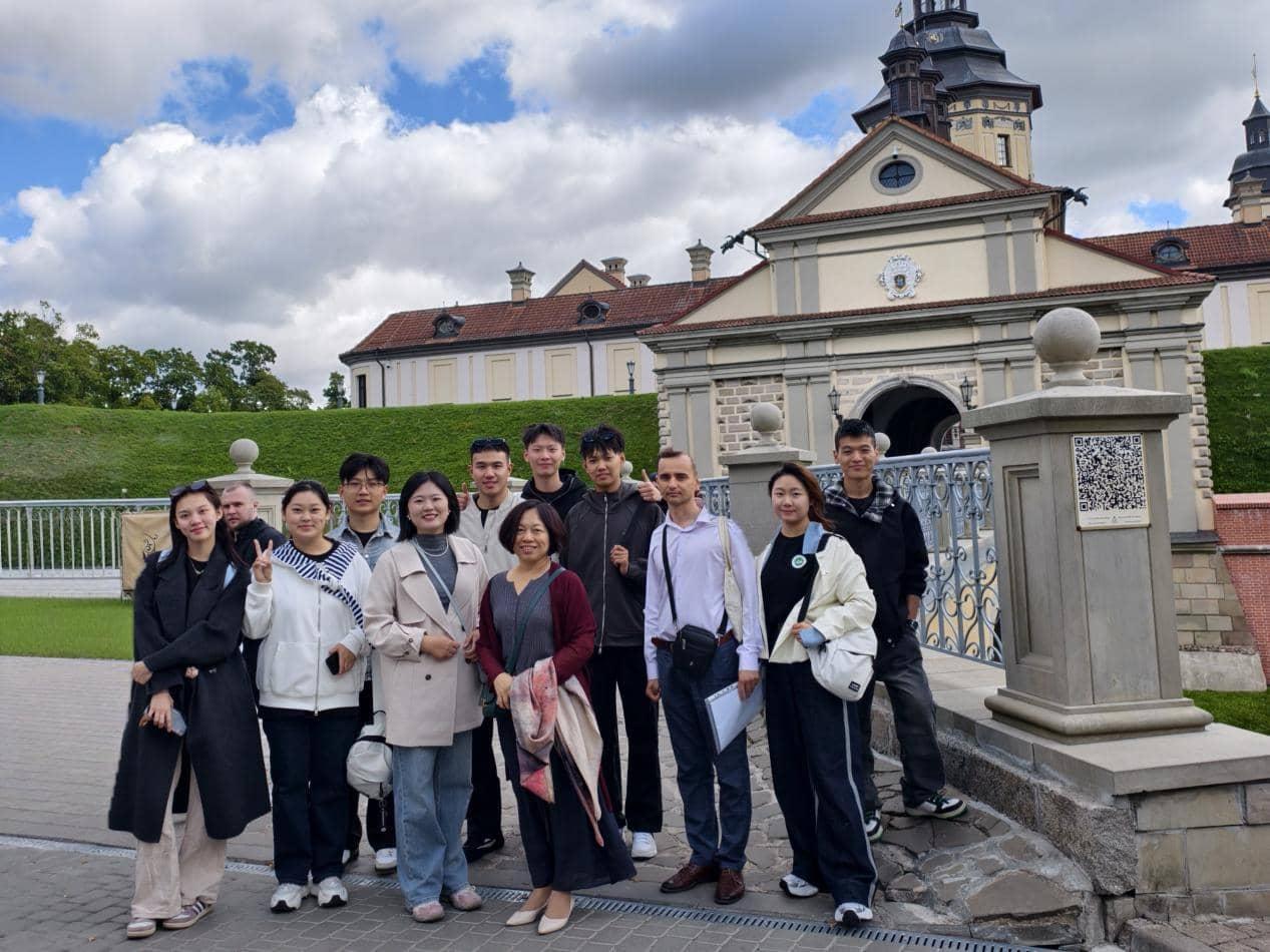 研学首站抵达白俄罗斯历史名城涅斯维日。始建于1583年的涅斯维日城堡,融合意大利建筑艺术与欧洲防御智慧,红砖古墙与静谧护城河默默诉说着百年沧桑。师生们穿梭于厅殿与展室之间,从铠甲、管风琴到石阶浮雕,感知从中世纪到现代的文化延续。参观时偶遇当地长者热情讲述往事,尽管语言存在隔阂,微笑却让东西方文化在此自然交融。随后,团队参访白俄罗斯国立师范大公司史博物馆,从泛黄史料与珍贵实物中,重温该校在战火中创校、在废墟中重建的艰难历程,深刻体会到白俄罗斯人民对教育不熄的热望与坚守。一砖一石,一纸一物,皆成为文化理解的窗口,也让304永利集团官网师生真切感受到教育超越民族与时代的磅礴力量。
