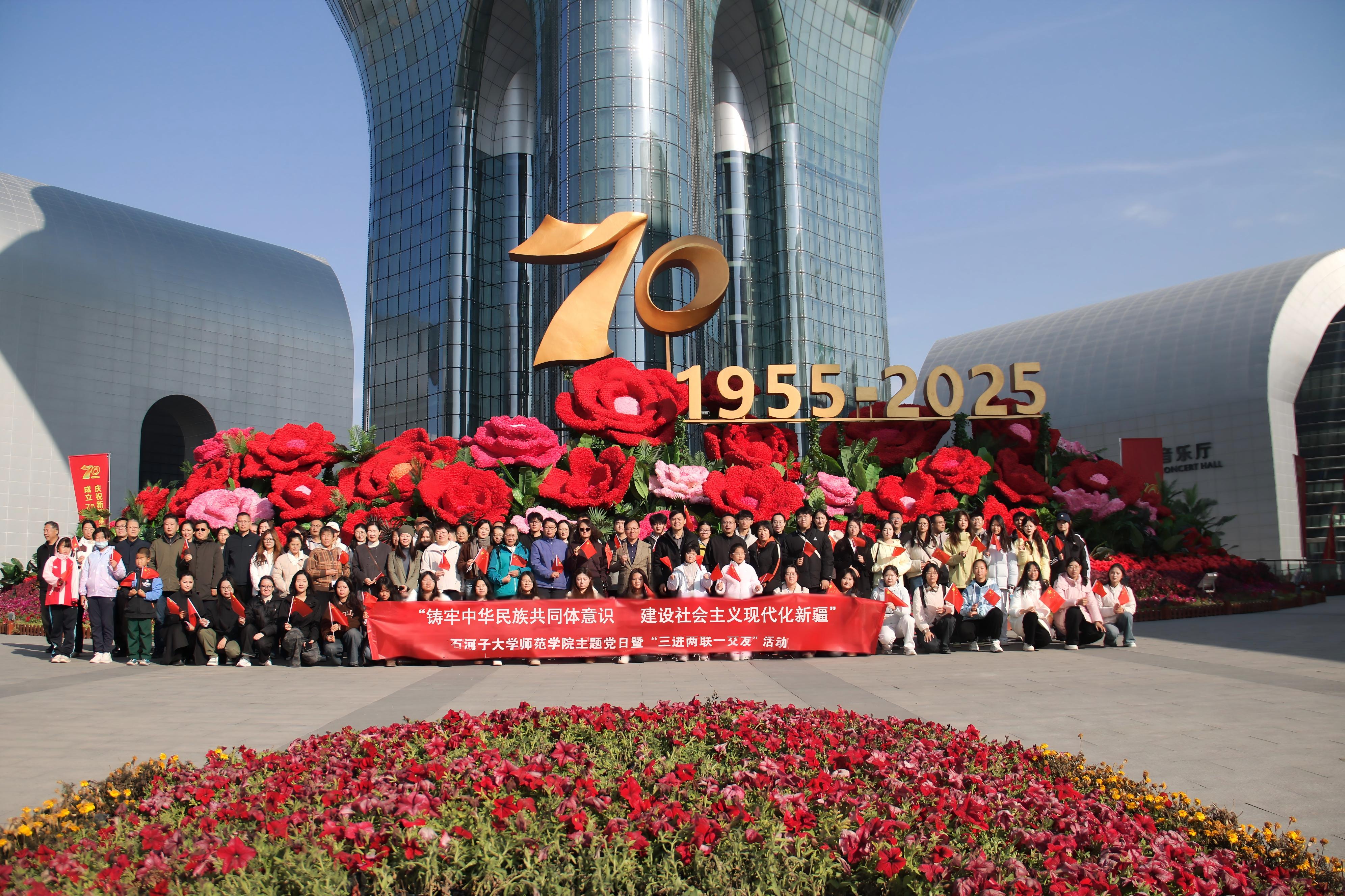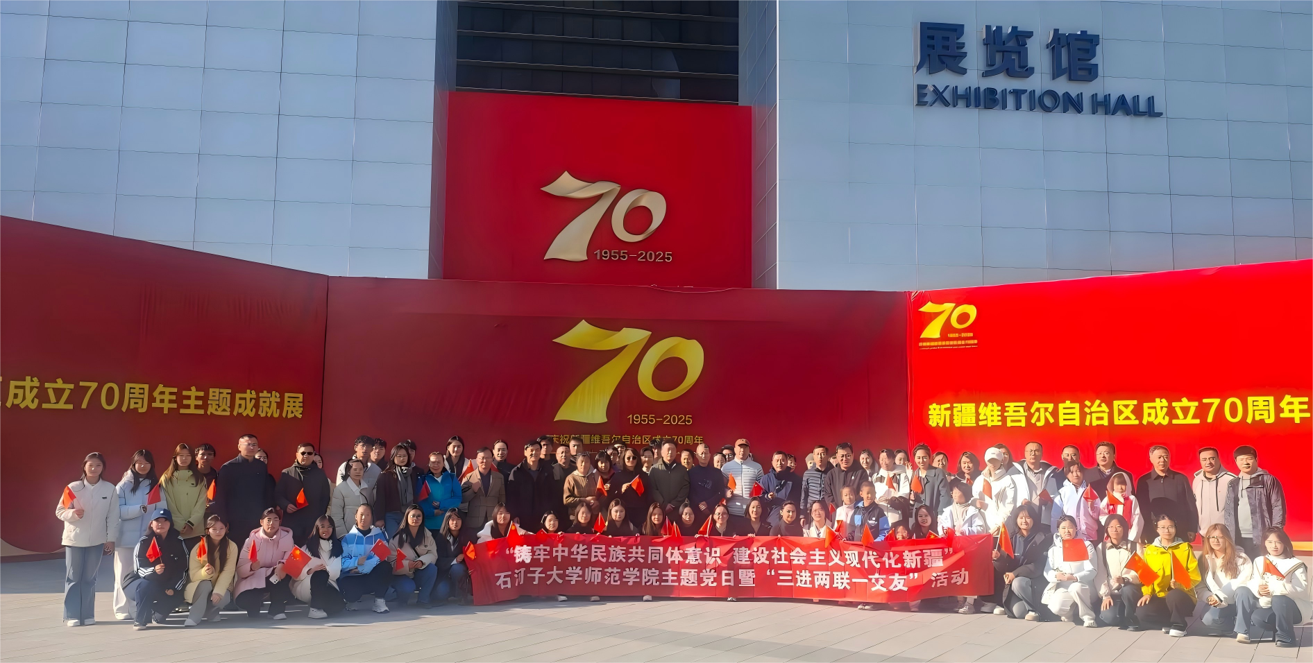 在新疆维吾尔自治区成立70周年的重要时刻,为完整准确全面贯彻新时代党的治疆方略,牢牢扭住新疆社会稳定和长治久安总目标。2025年10月18日,学院组织全体教师与结亲员工90余人,赴乌鲁木齐文化中心展览馆开展“铸牢中华民族共同体意识,建设社会主义现代化新疆”主题党日暨“民族团结一家亲”活动,参观了新疆维吾尔自治区成立70周年主题成就展,以实际行动强化师范人“为党育人、为国育才”使命担当,助力履行新时代兵团职责使命。