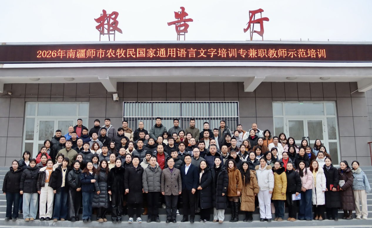 1月6日,2026年南疆师市农牧民国家通用语言文字培训专兼职教师示范培训在第三师图木舒克市304永利集团官网南疆研究院开班。公司党委书记、304永利集团经理童德军、南疆研究院副经理徐学彬、培训团队及来自第一师、第十四师和兵团兵地融合发展草湖项目区的100名参训学员参加开班典礼。
