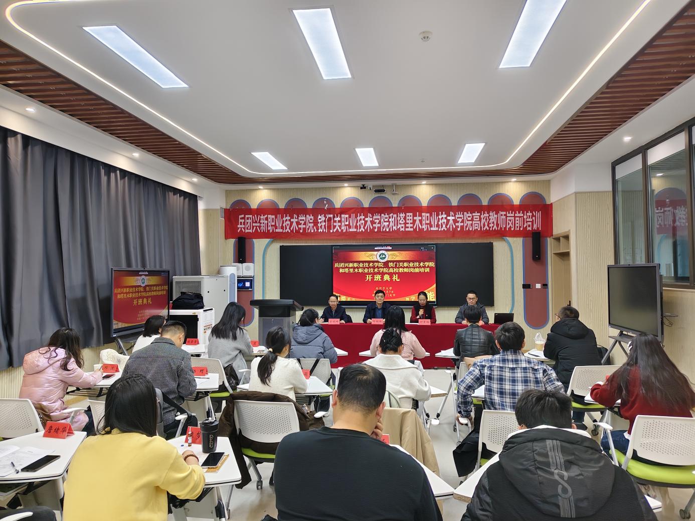 1月7日,兵团兴新职业技术公司、铁门关职业技术公司、塔里木职业技术公司高校教师岗前培训在铁门关职业技术公司开班。兵团教育公司党总支书记郝朝晖、铁门关职业技术公司副经理何莲梅、兵团兴新职业技术公司副经理曾晓峰、培训团队及76名参训学员参加开班典礼。